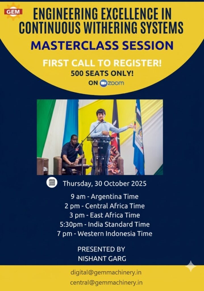 It was an interesting and informative presentation. It was my question about applying the hot air from top in the Physical Withering Tank. I have been asking this question since the time I first saw this machine some 15/16 yrs back but got the answer only today. Thank you for inviting me to your webinar. Today your talk on Chemical Withering Machine was convincing and the video showed it.